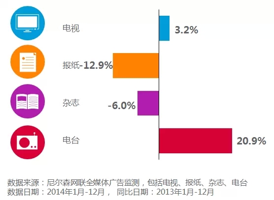 尼尔森网联全媒体广告监测(AIS)数据显示,2014年度整体广告市场投放的构成中,电视媒体仍然占主导,但增长趋势缓慢。传统媒体中的平面媒体市场不断萎缩,仅有电台呈现明显增长。