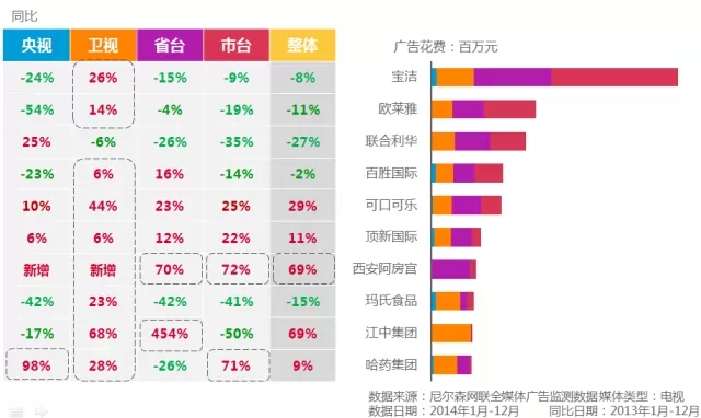尼尔森网联全媒体广告监测(AIS)数据显示,2014年除联合利华外,各大广告主纷纷加大了在卫视的投放。其中宝洁除卫视有所增长外,其他媒体的投放均有一定下降。