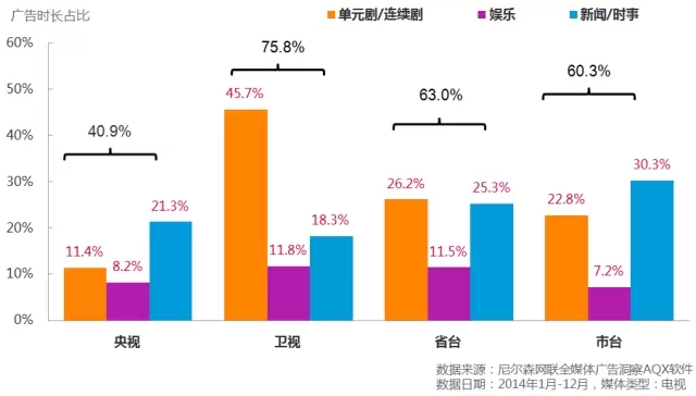 监测数据显示,央视、卫视、省级地面频道及城市台对节目的依赖度不同,而节目广告贡献度也存在差异。单一节目类型的广告贡献度过高,会对电视媒体自身的经营带来很大风险,而对单一节目类型依赖较高的媒体,内容形态和内容资源的研发与开拓变得至关重要。