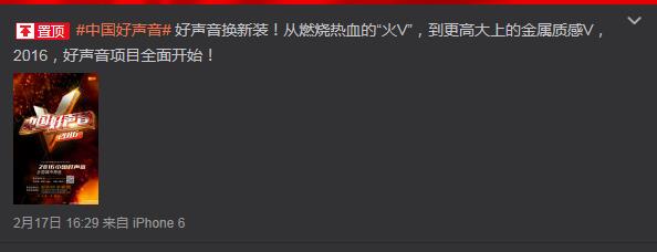 在经历与唐德影视争夺《中国好声音》的版权战后,灿星文化17日晚发布了新一季“好声音”的海报,并在好声音微博上称“好声音换新装!从燃烧热血的“火V”,到更高大上的金属质感V,2016,好声音项目全面开始!”