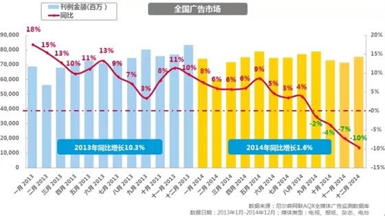 2014年整体的广告市场呈现了相对缓慢的发展态势,在1-8月延续了小幅度增长之后,从9月开始广告市场的整体投放相比去年出现了一定程度的下降。2014年广告市场同比去年增长为1.6%,考虑到刊例价格的上升等因素,这一增长幅度相对去年同比10.3%的增长率,处于一个较低的水平。