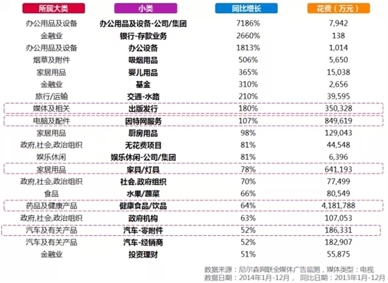 尼尔森网联全媒体广告监测(AIS)数据显示,2014年度整体广告市场投放的构成中,电视媒体仍然占主导,但增长趋势缓慢。传统媒体中的平面媒体市场不断萎缩,仅有电台呈现明显增长。