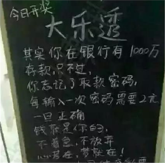 其实你在银行有1000万存款,只不过你忘记了取款密码,每输入一次密码需要2元,一旦正确,钱就是你的!不着急,不放弃,心若在,梦就在!